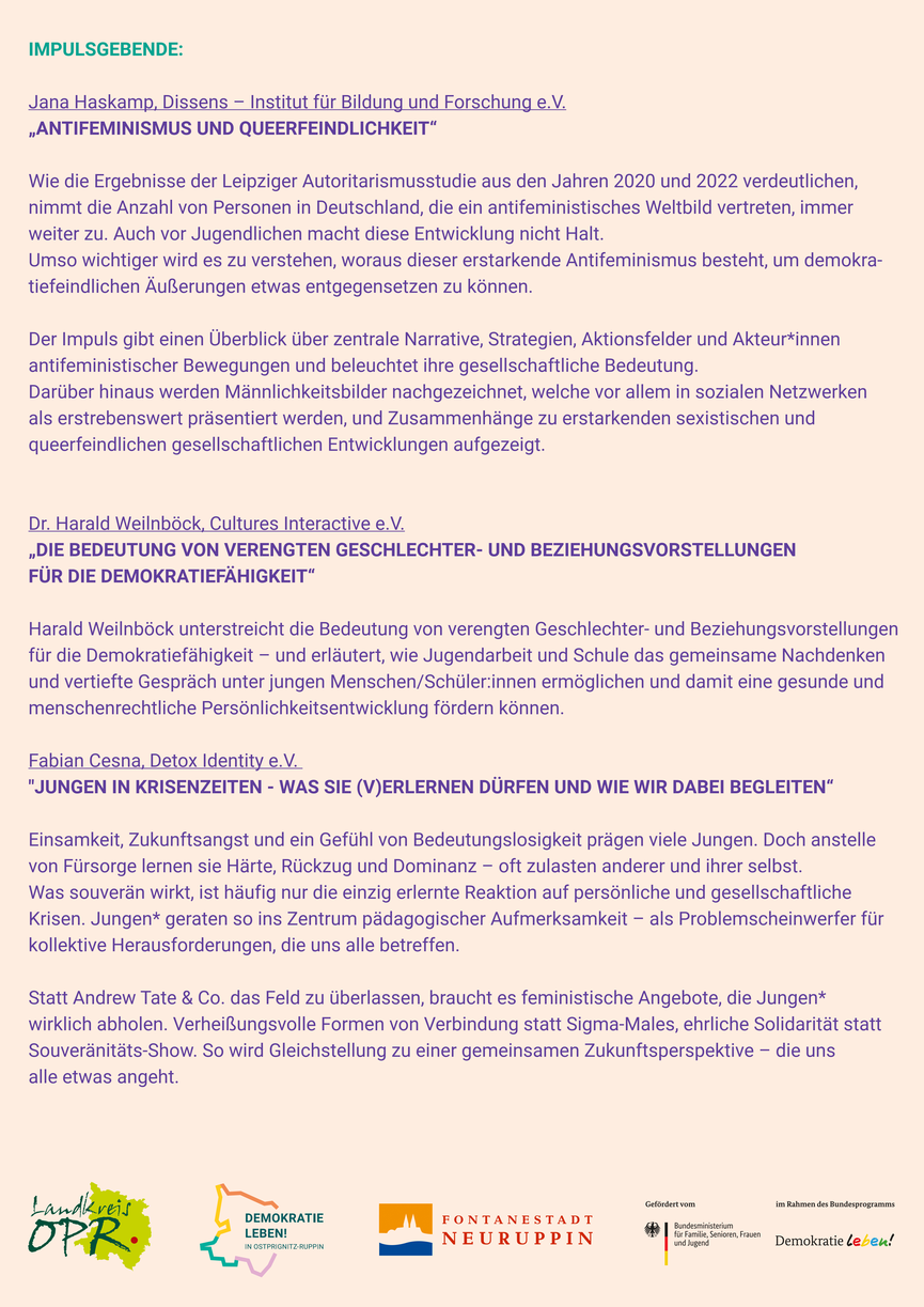 Zur Stärkung des Engagements in den Kommunen werden auch Bündnisse und Initiativen die keine Rechtsform besitzen von Demokratie leben! in Ostprignitz-Ruppin unterstützt. Kleinere Auslagen für Sachkosten (z.B. Öffentlichkeitsarbeit, Honorare für Künstler:innen, Technik etc.) können durch den Bündnisfonds finanziert werden.